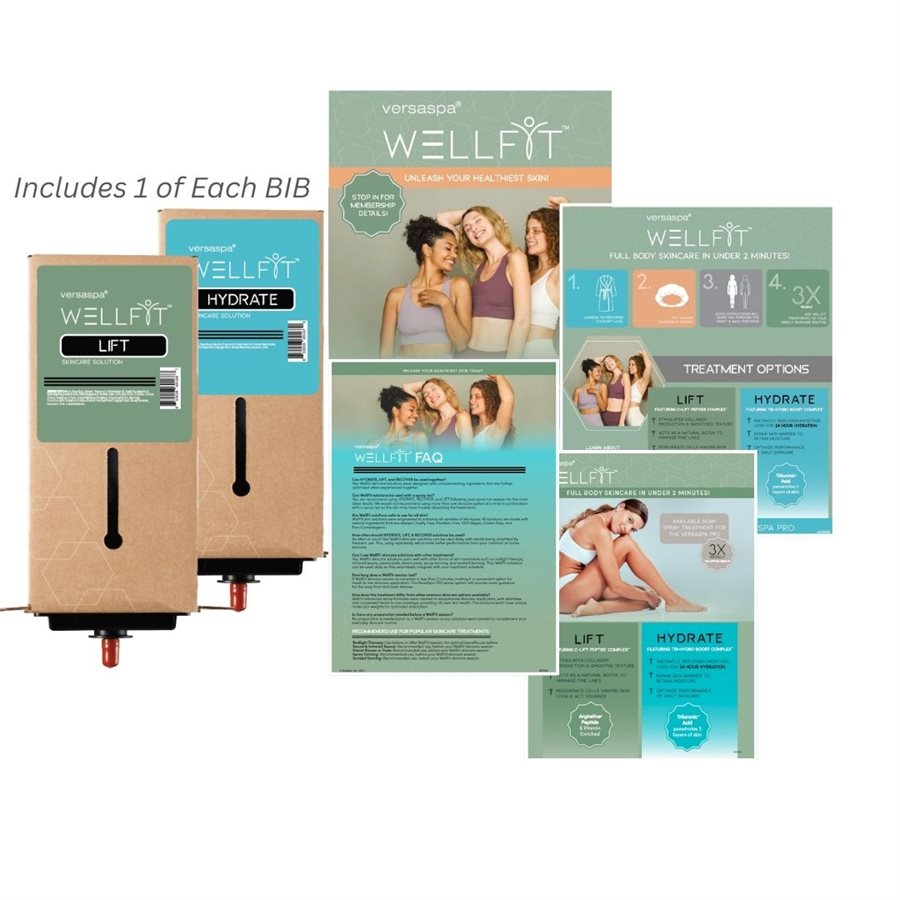 This WellFit premium marketing kit contains 1 each (bag-in-box 1.4gallon) of LIFT & HYDRATE solutions as well as informative marketing materials needed to start offering WellFit treatments to your clients!